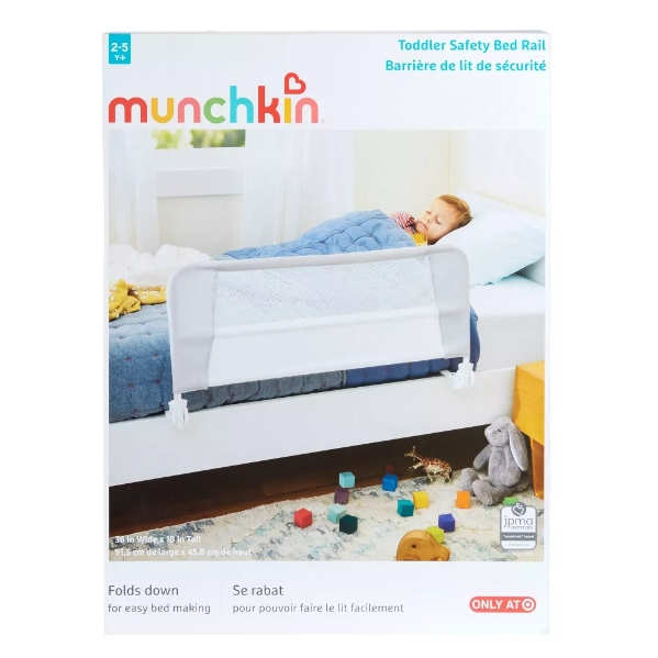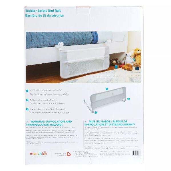 The Munchkin Safety Toddler Bed Rail keeps your little one safe and sound while in bed. The lightweight extendable metal frame, measuring 18" inches tall and extending 36" inches wide, is padded, covered with fabric, and fits mattress sizes twin to queen. The secure locking mechanism and convenient hinged folding design makes lifting your child and changing their bedding easy. And to make your life even easier, there is no assembly required.