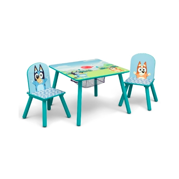Make everyday activities more fun with this Bluey Kids Table and Chair Set with Storage by Delta Children that features colorful graphics of Bluey and Bingo. This kids table and chair set features a table and two chairs, designed at the perfect kid-sized height, making it ideal for snack time, playtime or homework. Plus, a built-in storage compartment at the center of the table provides the perfect space to keep art supplies. About Bluey: Bluey follows the adventures of a lovable and inexhaustible six-year-old Blue Heeler puppy who lives with her dad, mum and four-year-old little sister, Bingo. In every episode, Bluey uses her limitless Blue Heeler energy to play elaborate games that unfold in unpredictable and hilarious ways.