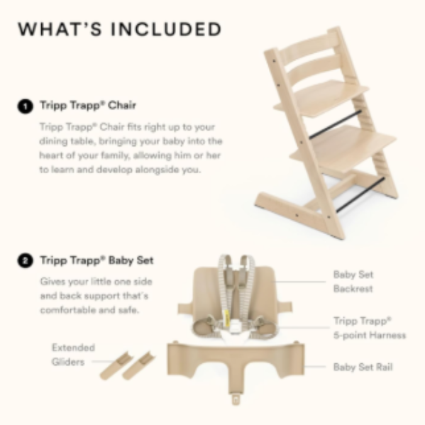 Included with this item: Adjustable chair, baby set and tray. If you need the infant attachment or just want the chair, please see the other rental options.