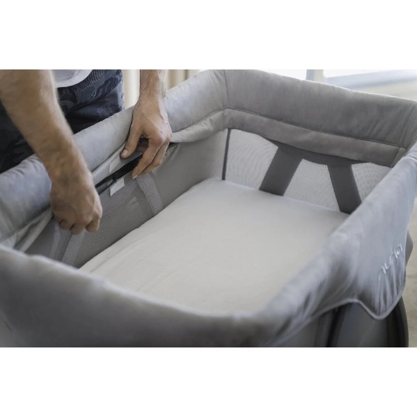 Keep them close in the Nuna play yard that doubles as a bedside crib. COVE™ aire’s evolutionary design includes a customizable reclined topper that turns COVE aire into a comfy seat for your infant and removes to reveal the full-size bassinet. As baby gets older unzip the bassinet for the perfect play space.