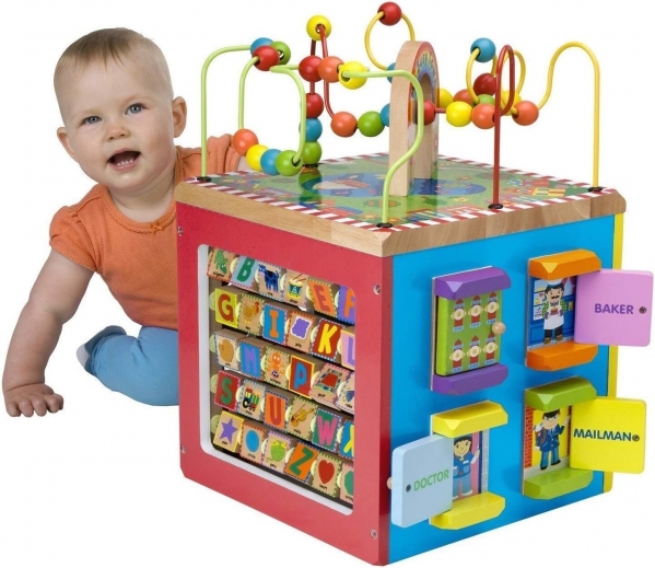 ALEX Discover My Busy Town Wooden Activity Cube has many activities to keep your toddler engaged that are all part of an amazing journey of learning through play. This toy features a sturdy wooden base that will withstand even the most demanding trips into Busy Town. The multi dimensional activity cube has five different sides of fun games for your little one; curvy bead mazes, peek a boo open and close doors, racing vehicle rollers, animal matching and ABC tiles. With so many different activities, your toddler is sure to stay entertained with this toy for hours. Stable, colorful and fun to look at, the activity center is made of sturdy wood and measures 16in. high by 12in. wide by 12in. deep. Recommended for children 12 months of age and up.
