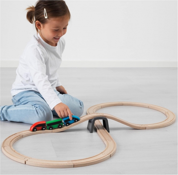 With this train you can go round and round and round, as long as you like. All aboard for hours of fun! Chugging around the room, loading the cargo, piecing the track together, and building new combinations. Little engineers love solving the daily challenges at the train yard.