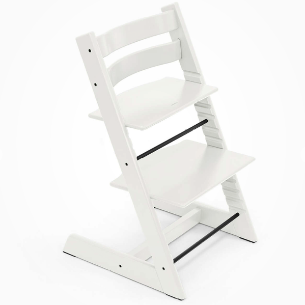 The Tripp Trapp High Chair brings your child right up to the table. The Tripp Trapp Baby Set is best for children from 6-36 months, but the chair can hold up to 300 lbs. Available in white, grey, and black.
