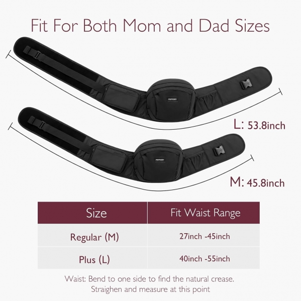 Lightweight & Versatile: Momoczoy Baby Hip Seat Carrier weighs less than 1 pound, making it a breeze to carry. It also doubles as a diaper bag with a spacious storage compartment. The Momcozy hip seat is designed to accommodate parents of various body types, with two sizes available: M (27-45 inches waist) and L (40-55 inches waist).