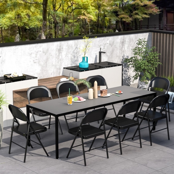 Get 4 black metal folding chairs to round at the seating at your next party! Pairs great with the black folding tables!