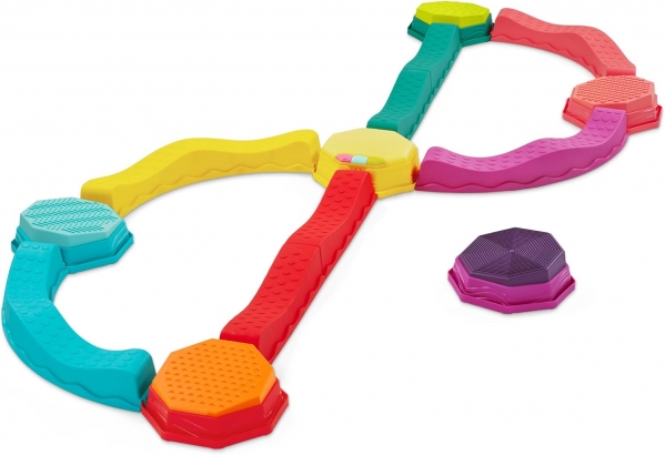 Step into musical active play with the Balance & Groove Set from B. toys! This innovative balance beam toy features wavy beams, curved sections, and a special guest star: a glowing musical stepping stone! This colorful active playset lets kids create endless combinations with the wavy beams and sensory stepping stones – it's even easy enough for them to take the lead. But that's not all! The musical stepping stone also features three exciting musical games: Freeze Dance, Hop-to-It!, and Dance Party! As kids play, they'll develop gross motor skills and coordination while staying active and creative. The set's tactile surfaces promote sensory development, and the musical games are great for solo play or group fun. All the pieces stack neatly for easy storage. Recommended for ages 3 and up.