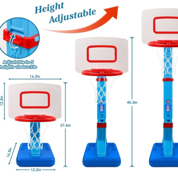 Height-adjustable Basketball Hoop for Toddlers: There are 5 slots on the rod for height adjustment. The adjustable range is 2.3-4.5 feet (please fix the rod with the red bulge after adjustment). It is suitable for all boys and girls of different heights over 3 years old. Raise the height of this toddler basketball goal to increase difficulty as your kids grow; both your kids' shooting skills and dunk skills can be exercised.