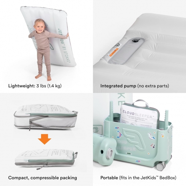 COMPACT TRANSPORT - Unlike many travel beds, you can store and transport the CloudSleeper with minimal fuss. The included packing cube allows for compact storage and easy, lightweight transportation—it’ll even fit in your JetKids BedBox!