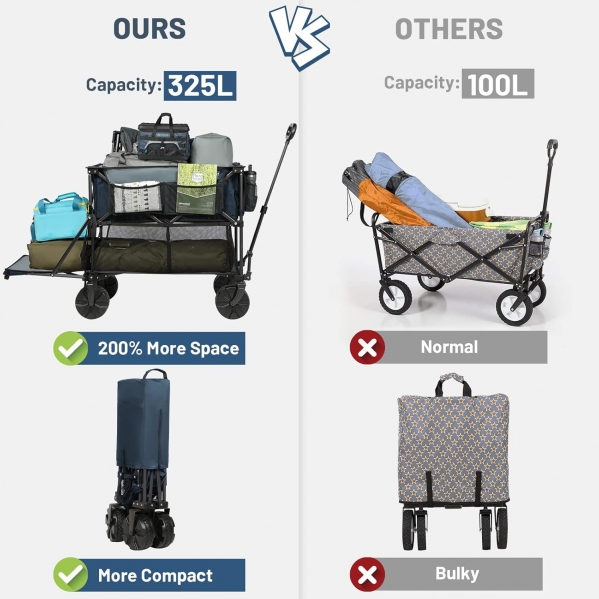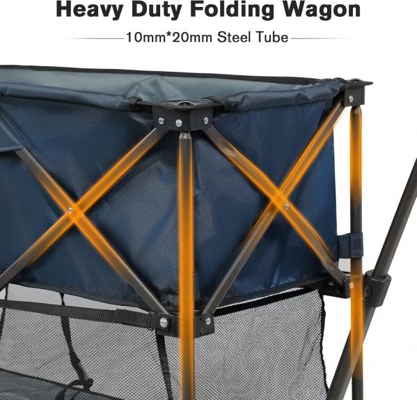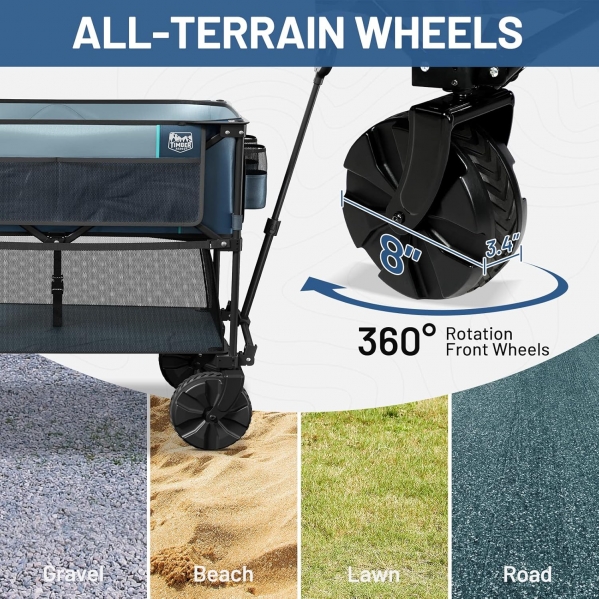ALL-TERRAIN PERFORMANCE: Equipped with 7.5" diameter all-terrain wheels with brakes,the middle tread is made of rubber, quiet and wear-resistant; 360° rotating front wheels and enable this wagon to maneuver easily.