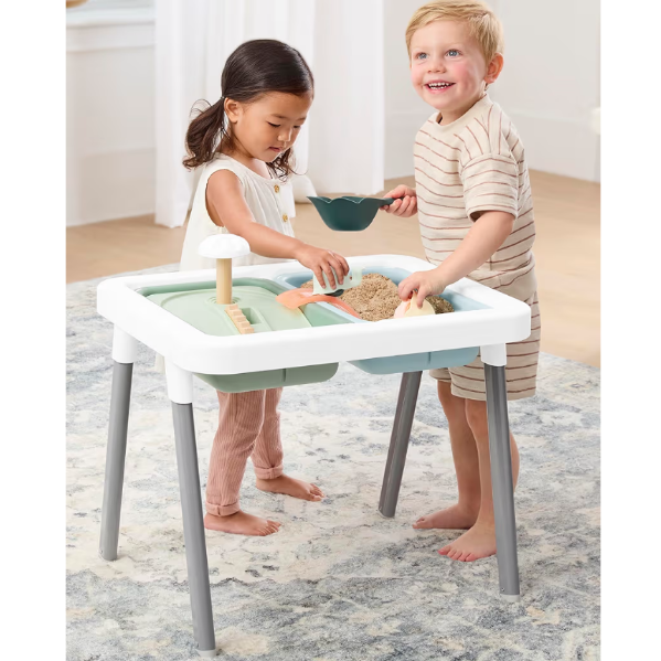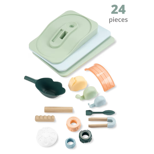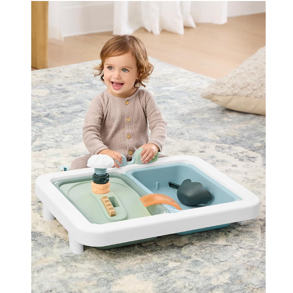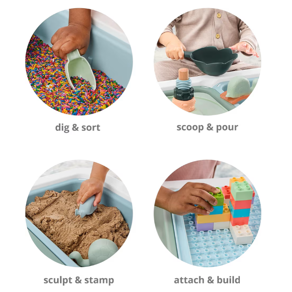 Developed in collaboration with a sensory play expert, our 24-piece sensory table set offers limitless ways for kids to explore, learn, create and play. Designed to grow with your child, early exploration begins with floor play and the included tools (wooden tongs & rollers, animal scoops, shovel rake & more)—they can be used in so many ways! As your little one grows, add the legs to the sensory table for toddlers and experiment with fillers such as sand, dry pasta, water, sculpting clay and more found objects. Dig, sort, sculpt, scoop, pour & more—stretch your imagination and create a hands-on landscape for sensory play and discovery. Need ideas? The included activity guide has lots of ways to play with our sensory bin table to inspire you and your kids for years of learning & fun.