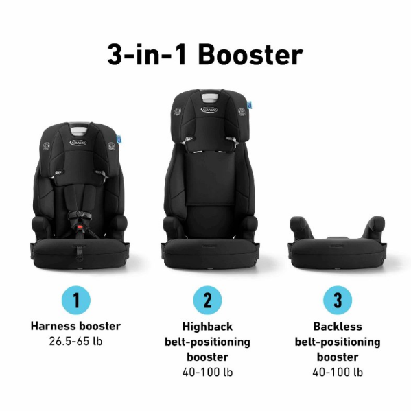 The Graco Tranzitions 3-in-1 Harness Booster is designed to grow with your child and go with you, wherever your journeys take you—from car to carpool and beyond. This lightweight car seat transitions seamlessly from harness booster (26.5-65 lb) to highback booster (40-100 lb*) to backless booster (40-100 lb) and features the Simply Safe Adjust Harness System, which adjusts your harness and headrest to 9 height positions, with no rethreading. It features two rotating cup holders to keep your child happy, a machine washable seat pad, and harness covers. *To continue to meet industry standards, we have increased the weight minimum from 30 to 40 lb.