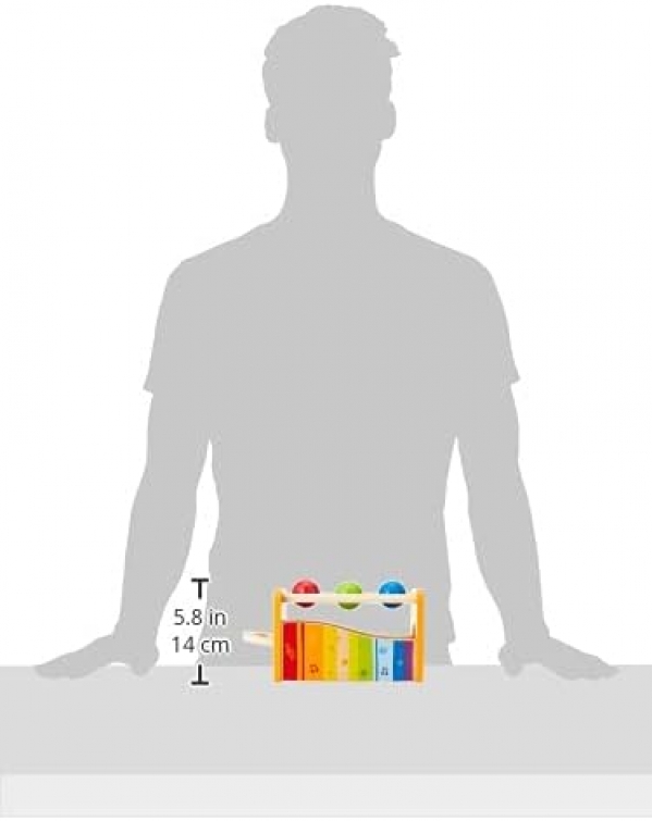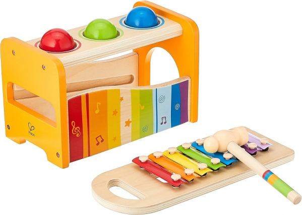 Hape's Pound and Tap Bench with Slide Out Xylophone is a multifunctional musical delight and sound experience for toddlers. Toddlers ages 12 months to 3 years can explore different notes and sounds by letting the balls fall on the keys or slide out the xylophone to create their own unique sound with a wooden mallet.