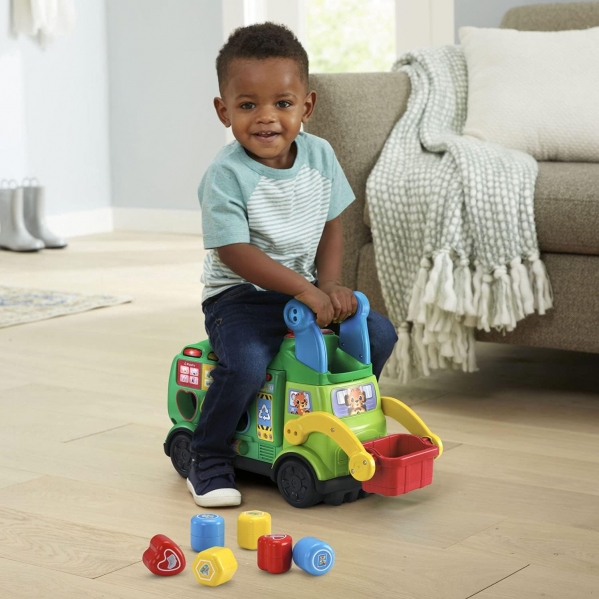 Load up the red heart, yellow hexagon and blue circle play pieces that represent plastic, metal and paper. Sort them into the correct bin, just like at home. Kids can also explore ways to repurpose everyday items or take a quiz to reinforce what they’re learning. Reuse and remix the included melodies by inserting a block in a bin to add sound effects that make each melody sound new. Blocks store inside the truck for easy cleanup.