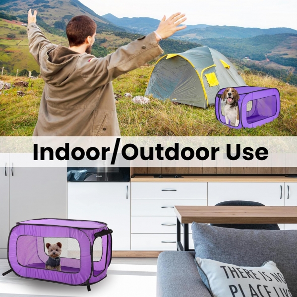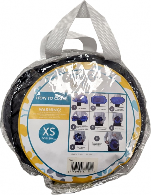 This lightweight collapsible dog crate is the perfect pet kennel for keeping Fido with you on all your travels. The roomy pop up kennel packs down to a compact 9" round disk weighing 1 lb. to make it portable and easy to pack. Made of lightweight durable polyester with mesh window screen panels for ventilation and visibility. Works great as a dog bed too. Overall dog crate measures 24"L x 16.6"W and 16"H. Dual zippered door opening measures 12.5" x 12".