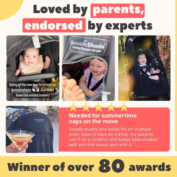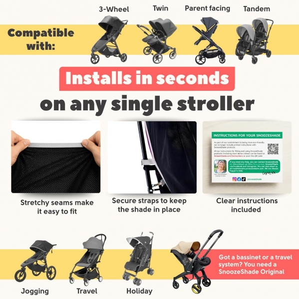 SnoozeShade Plus Extra, Stroller Sun Shade, Mosquito Net for 6m+ Babies, Blocks 99% of UV (UPF 50+) Universal Fit Blackout Sleep Cover with Peekaboo Window, Breathable Mesh Canopy for Single Strollers Black with grey trim