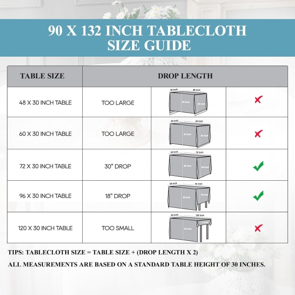 • Product Size: 90*156 inch white rectangular tablecloth for 6ft table and 8ft dining table, according to the effect you want to use the tablecloth, and the size of your dining table, choose the right size tablecloth