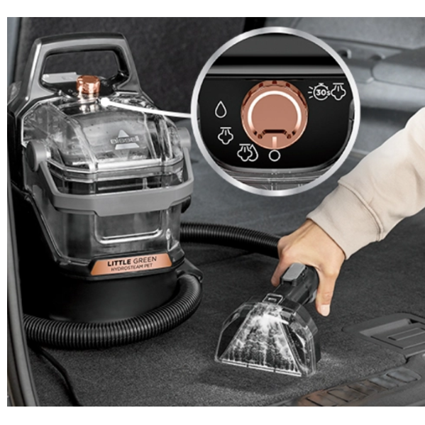 Thanks to the power of HydroSteam® Technology, BISSELL® Little Green® HydroSteam® Pet portable deep cleaner tackles the toughest and oiliest stains up to 50% better. It cleans across multiple surfaces, like carpet, upholstery, auto interiors, tile, and even sneakers with its 3 different cleaning modes.