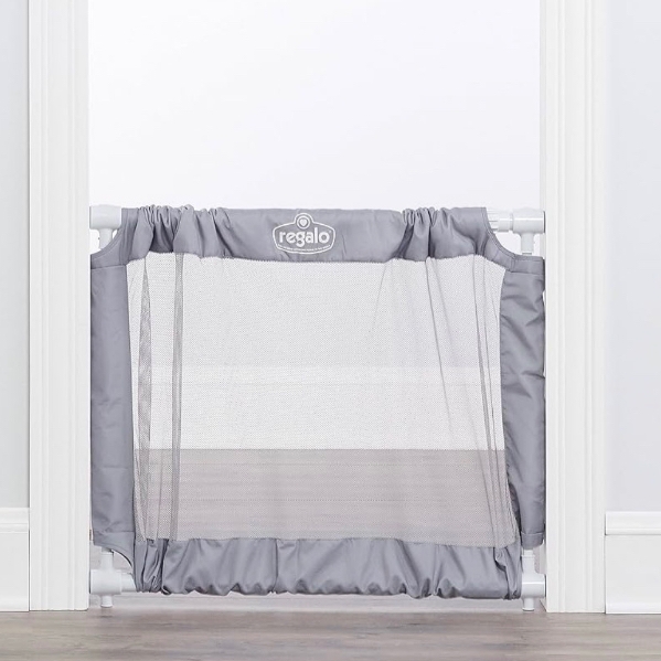 The Regalo Expandable Mesh Safety Gate is a simple and effective way to protect your baby and home. Made of high-quality mesh, the baby gate expands to fit openings between 27.5-50” and stands at 28” tall. The pressure mount expandable gate has soft rubber bumpers that are gentle on your walls and make installation painless. To install, assemble the telescoping metal tubes to the size of your doorway. Use the easy turn-to-lock system and pressure the gate in place.