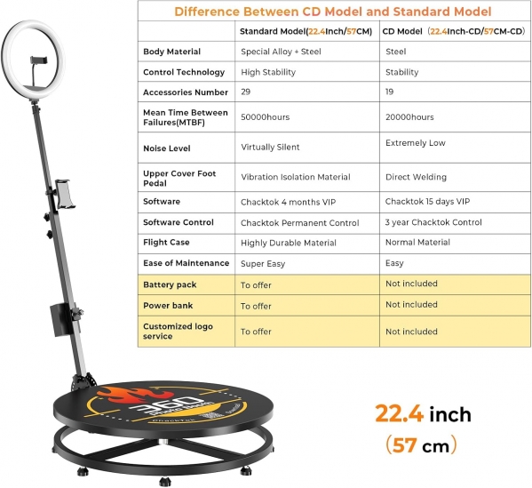 360 Photo Booth Machine for Parties] The ring light wth 3 colors lighting mode, and each lighting mode have 10 adjustable brightness. You can make 360-degree panoramic spin videos and fantastic photos, and share them to your social media account instantly such as Facebook, Instagram, Youtube,Twitter, and Tiktok etc.it does not include free batteries and customized logos