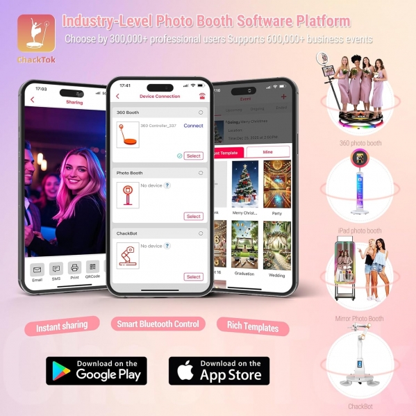 360 Photo Booth Machine includes the ChackTok APP, which functions as a real-time control and editing software for creating content:App Features:
