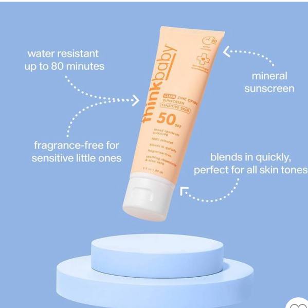 Gentle on skin, tough on rays! thinkbaby Sensitive Skin Clear Zinc SPF 50 pairs soothing chamomile and moisturizing shea butter with non-nano zinc oxide- perfect for little ones with extra sensitive skin. It's complete, dermatologist-trusted protection all in a mineral-based, fragrance-free formula that stays water-resistant for 80 minutes.