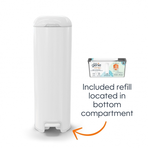 Designed by Diaper Genie, this upgraded system features a durable stainless steel design and advanced odor-locking technology to keep everything sealed and contained.