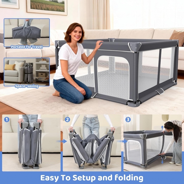 This foldable playpen creates a secure, spacious area for your baby or toddler to play, giving you peace of mind in an unfamiliar space. Whether you're unpacking, getting ready, or just need a break, it keeps your little one safely contained and entertained.