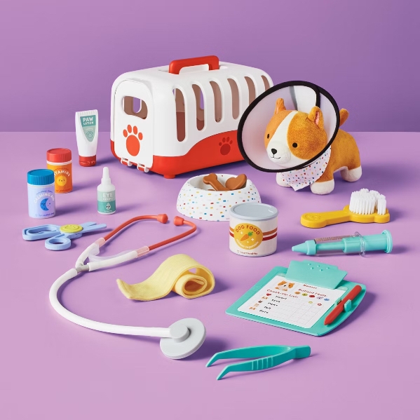 This 22-Piece Vet Play Set from Gigglescape™ will introduce your little one to the world of pet care. This kit comes with 22 different pieces, including a plush puppy, a dog carrier, a bandage roll, eye drops, a stethoscope, a clipboard with patient info and much more. Great for promoting creativity, problem solving and fine motor skill development, they'll have tons of fun pretending to be a veterinarian while learning how to care for a pet.