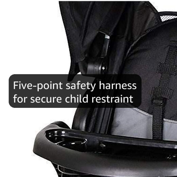 The stroller features a multi-position reclining padded seat with a fully adjustable 5-point safety harness and tether strap and a child's tray with cup holders that also accepts the infant car seat.