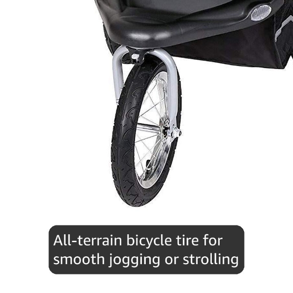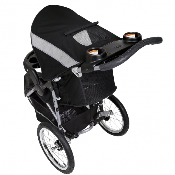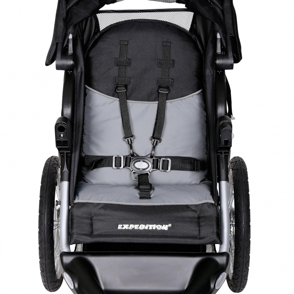 The Baby Trend® Expedition® Travel System. The stroller features a lockable front swivel wheel for jogging or it unlocks for easy strolling. The all-terrain bicycle tires also feature a quick release for extra compact storage. The stroller also features a parent tray with 2 cup holders and covered storage and a large storage basket. The push handle is extra wide, ergonomically shaped and foam padded, and the adjustable canopy with a peek-a-boo window that ratchets to block the sun and wind.
