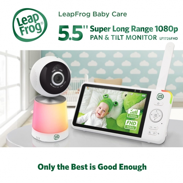 Watch over your little one on the 5.5-inch,1080p High-Definition Super Long Range LCD Parent Unit Display with the LeapFrog LF1726FHD video baby monitor. Monitor your baby up to 2,500 feet away from the camera with the industry's best range. View rooms from top to bottom with the 80-degree vertical-tilt angle and from side to side with the 360-degree horizontal pan capability. Magnify details up to four times their original size with the crisp digital zoom range and monitor room temperature and humidity levels directly from the Parent Unit Display. Plus, see your baby as clear as day, even in ultralow light, thanks to the automatic Color Night Vision.