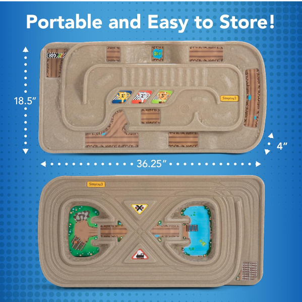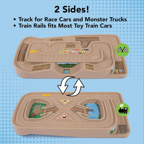 Reversible car/monster truck track and train track. Easy to play with on a table top or floor indoors. Will come with cars and trains.