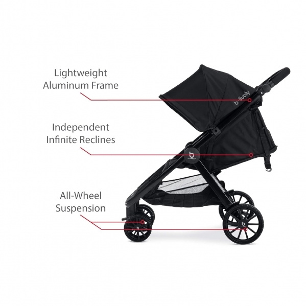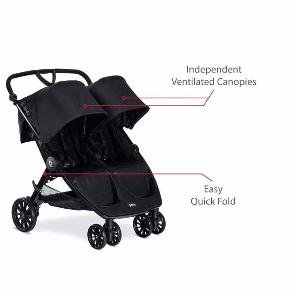 Cruising smooth is twice the fun with the B-lively double stroller. Designed with an adjustable handlebar for the perfect fit, the modern, square shaped frame and self-standing quick fold make this trendy Britax stroller easy to navigate, transport, and store. It is easy to store and grab gear on the go thanks to extra-large under seat storage with front access and 6 back pockets.