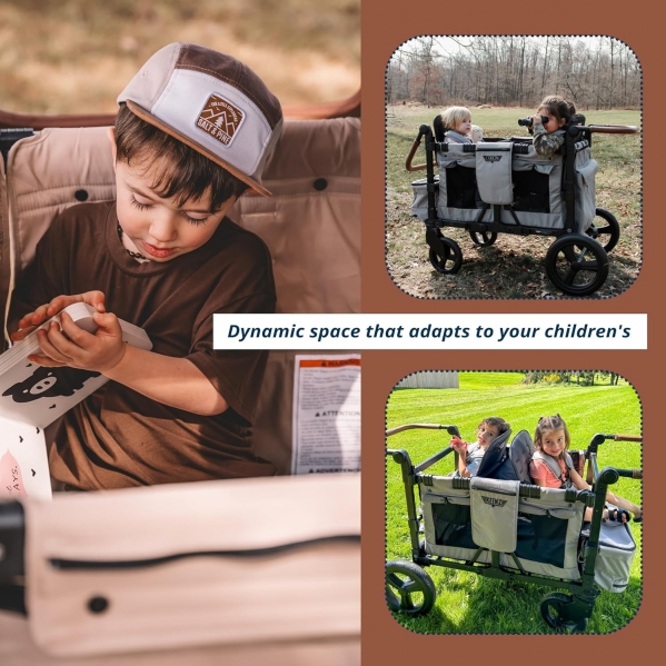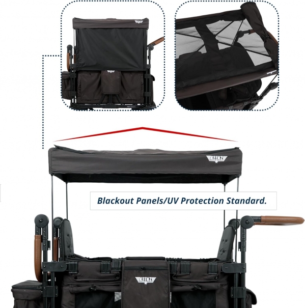 The Keenz Vyoo stroller wagon has a total weight capacity of up to 326 pounds, 55 pounds per seat, and it is recommended for ages 6 months and older.