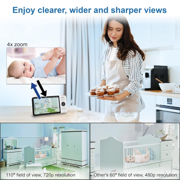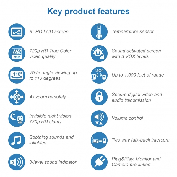 The VTech VM818HD Video Baby Monitor allows you to check in on your little one on the 5" parent unit in 720p High Definition. Soothe your baby using the night light and lullabies and soft sounds that play right from the baby unit. Plus, you can make sure your infant is cozy by monitoring the nursery temperature that's displayed right on the LCD screen. Baby need you? Let them know you're on your way with the two-way, talk-back intercom. It easy to check in, even during nap time with the auto night vision that gives you a clear view of the crib without disturbing your little one's sleep. Plus, a built-in temperature sensor lets you know if it's getting too hot or too cold in the nursery with an alert on the parent unit.