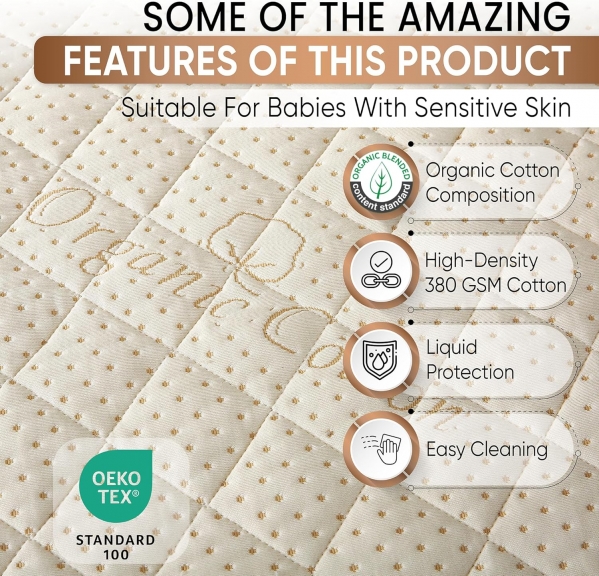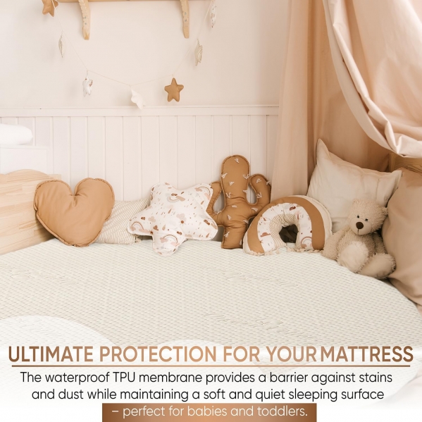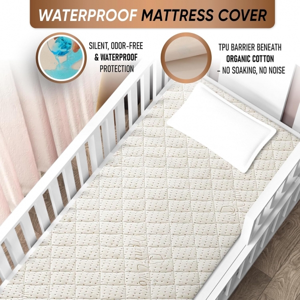 WATERPROOF & BREATHABLE PROTECTION: Our upgraded 250 GSM crib mattress protector features a soft and breathable organic cotton surface, a quiet waterproof TPU layer underneath, and a durable polyester skirt — creating a comfortable, non-sweaty barrier against accidents and spills.