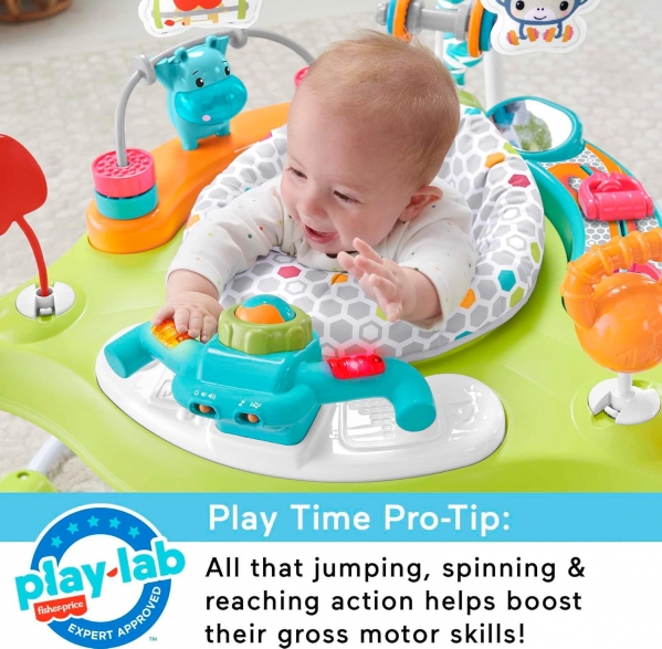 With the Fisher-Price Fitness Fun Folding Jumperoo activity center, your baby can bounce into gym-themed action! This activity center offers 360 degrees of workout-themed fun, including spin bike handlebars with lights and music, a roller ball, apple teether, hippo weightlifter bead bar, dumbbell-shaped clacker, mirror, resistance band slider, and kettle bell rattle! The seat adjusts to three different heights.