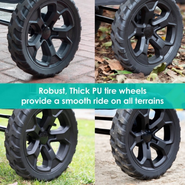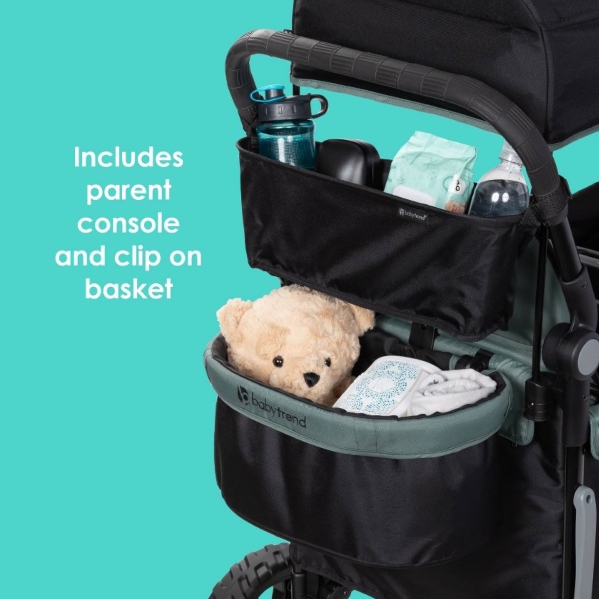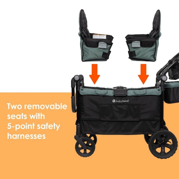 Unlock Outdoor Fun with Baby Trend Quest PLUS 3-in-1 Stroller Wagon! Transform it into a bench by simply dropping down the side bar, creating a convenient seat for your little ones and allowing them to get in with ease during picnics. Adjust visibility easily by rolling up the side shade and securing it with a zipper, while air-flow netting protects against harmful elements. The super-large cargo area, featuring two removable seats with five-point safety harnesses, ensures your little ones’ safety. The child tray allows you to keep snacks close by with two cup holders and center consoles for each child. The wagon features both push and pull handles, adjustable to three different heights. The robust, thick PU tire wheels provide a smooth ride on all terrains. The convenient storage pockets keep your belongings safe and accessible. A flip over basket can easily be attached to the front or rear of the wagon, adding more storage capabilities. With Baby Trend Quest PLUS 3-in-1 Stroller Wagon, make the best family travel memories.
