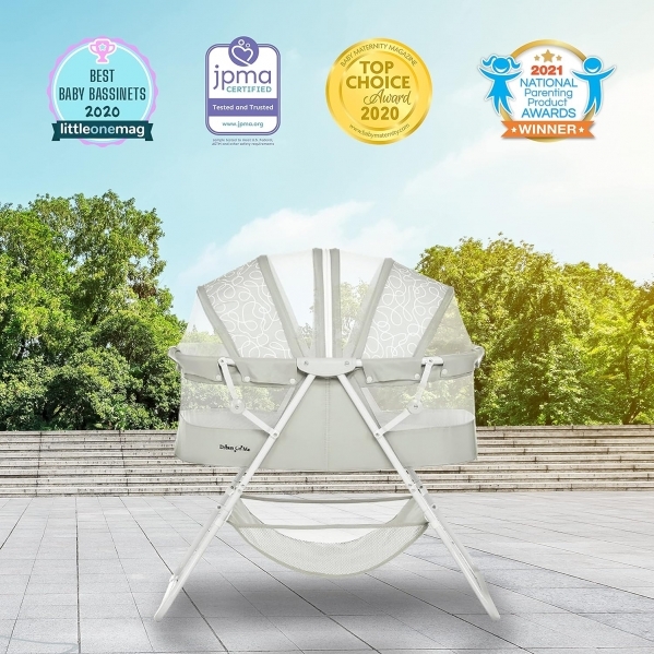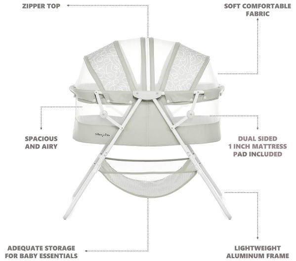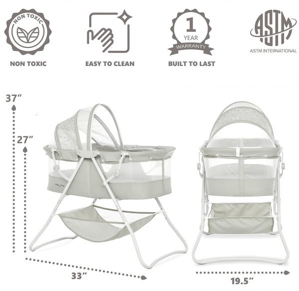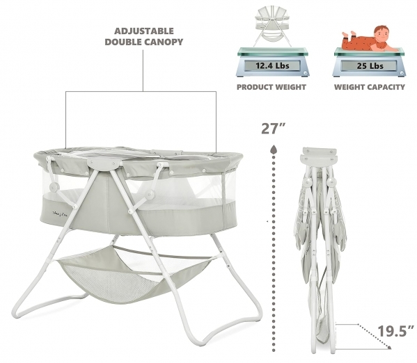 PRODUCT DESCRIPTION Style:Karley| Color:Cool GreyLightweight, stylish and spacious- the Karley bassinet is every new parents' Dream come true! One of its standout features is its portability. Weighing 12.4 lbs, it comes with a no-tool assembly & a lightweight aluminum frame, which allows you to move it from room to room. Thanks to a quick-folding mechanism, you can carry it outdoors without any hassle and use it There as well! You'll never be short of space with the Karley bassinet. It is spacious and airy and comes with an adjustable double canopy that keeps nasty bugs and curious Pets at bay. Your baby's essentials are never far away thanks to the attached large storage bag. It comes in nine beautiful finishes to blend in with any nursery theme. It is made of easy-to-clean soft and safe polyester foam fabric. It comes with a dual-sided 1-inch thick mattress pad as recommended by the ASTM/CPSC. Mattress pad dimensions are 30Lx15Wx1H inches. Bassinet dimensions are 33Lx19. 5Wx37H. The height with the canopy is 37 inches, Height without is 27. Recommended for newborns up to 25 lbs. It meets flame retardant requirements of CPSC, CA prop 65, Vermont act 0085 (bill S.81), NY law 37-0701/9.