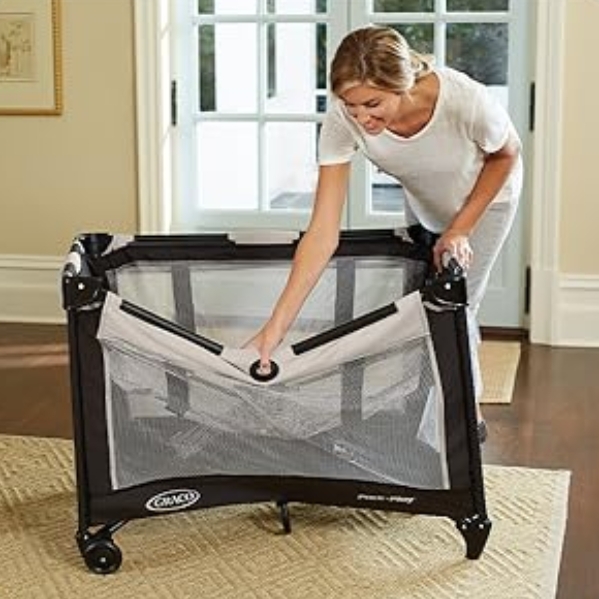 From manufacturer: When your little one needs a place to nap or play right away, there’s no more convenient solution than our Pack n’ Play Playard. Its durable frame makes it perfectly suited for travel. The signature Graco push-button fold allows you to break it down in seconds, makes closing your Playard quick and hassle-free and the automatically folding feet and wheels make it amazingly compact when folded. At home or away, your young one will have sweet dreams and comfy surroundings.