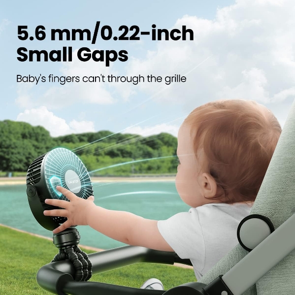 Safe Design for Baby: The mini stroller fan's cover only has 5.5mm gaps, so it will protect the infant's little fingers from entering; While keeping toddlers safe, our fans work quietly and provide powerful wind