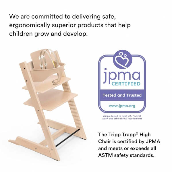 The Tripp Trapp High Chair brings your child right up to the table. The Tripp Trapp Baby Set is best for children from 6-36 months, but the chair can hold up to 300 lbs.