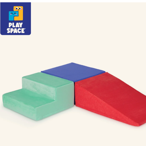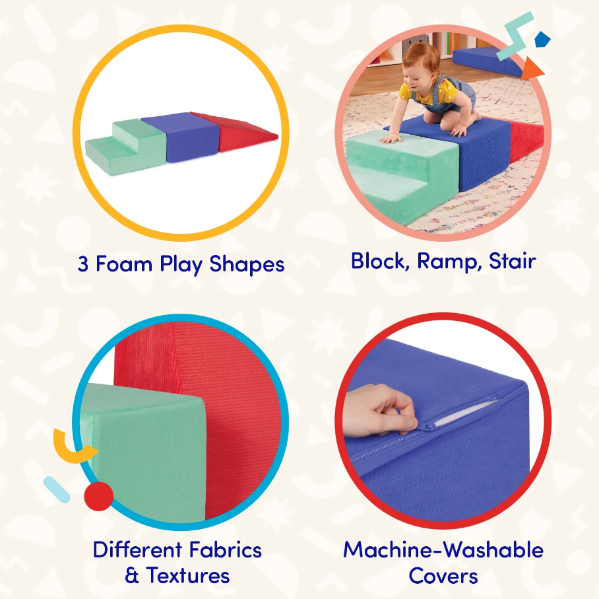 Stack, slide, and smile with the versatile Squishy Stack Climbers from Play Space by Battat! This set of 3 foam multicolor shapes includes one soft block, a ramp, and a stair. Stack them high, create an obstacle course, or add them to fun forts – the play possibilities are endless! The lightweight foam allows kids to easily rearrange their play space, while the different fabrics and textures add a sensory touch to playtime. As kids slide, walk, and climb over the super-soft shapes, they'll also be developing gross motor skills and staying active. Not to mention, all the covers are easily machine-washable! Recommended for kids 12 months and over. Build the ultimate playroom with the Squishy Stack Climbers and other wonderful toys from the Play Space collection by Battat.