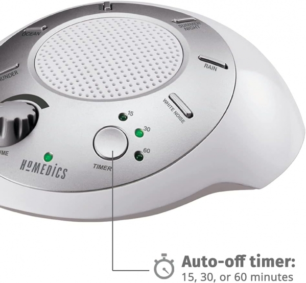 6 Soothing Sounds: Choose from 6 digitally recorded sounds: White Noise, Thunder, Ocean, Rain, Summer Night, and Brook; mimics the natural environment for the most relaxing experience possible. Compact & Portable for Travel: The HoMedics Sleep Sound Machine is small and lightweight so it easily fits into your purse, bag, or suitcase; easy to bring your sleep sounds with you wherever you go. Auto-Off Timer: Play sounds continuously or choose from 3 auto-off timer options: 15, 30, or 60 minutes; plug it into a wall outlet with the AC adapter (included) or use 4 AA batteries (not included)