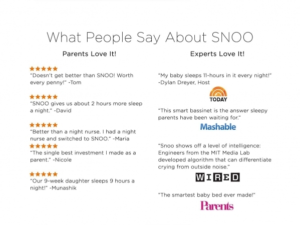 Created by Dr. Harvey Karp, SNOO Smart Sleeper is the first responsive bassinet that boosts sleep for babies and parents! BENEFITS -Adds 1+ hours a night by automatically responding with increasing levels of white noise + motion to quickly soothe fussing -SNOO Sack attaches to safety clips that secure baby safely on the back and prevent risky rolling -MOBILE APP Easy to customize with gentle preemie/newborn setting and weaning option to transition baby to crib -Tracks your baby's progress in sleep log Alerts parents if the baby needs more attention