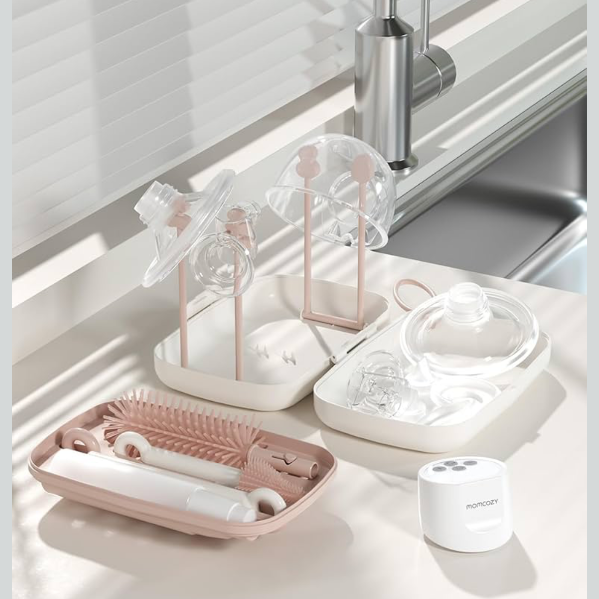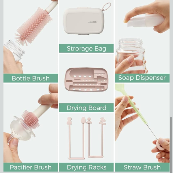 Best Cleaning Tool:Momcozy 7-in-1 baby bottle brush set includes a silicone bottle brush, bottle drying rack, straw cleaner brush, nipple brush, soap dispenser, and a convenient storage box. With this set, you'll have everything you need to keep your baby's bottles clean.