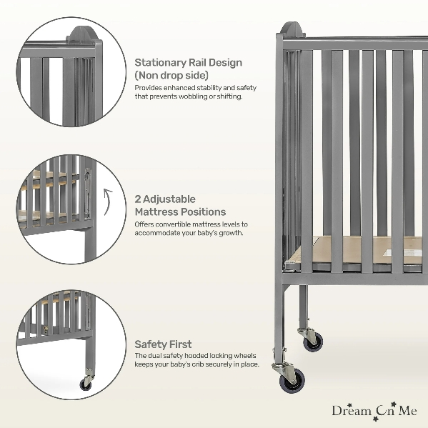 The Dream On Me Folding Full Size Crib offers two adjustable mattress height positions and heavy duty locking wheels. This crib is ready to use by simply unfolding and locking into place, making it perfect for guests with babies and for grandparents, caregivers, daycares, and hotels. The stationary rail design (doesn't drop down on the side), the locking feature, and the heavy-duty commercial size sheels ensure safe use.