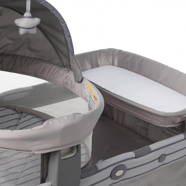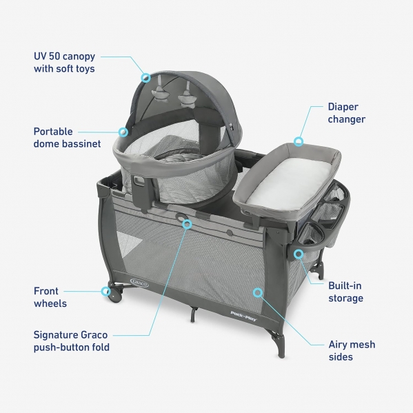 The Graco Pack 'n Play® Travel Dome™ LX Playard features a portable Travel Dome LX bassinet that can be used in or out of the home, so that you can keep baby by your side anywhere. The removable bassinet features a UV 50 canopy and carry bag, for comfort and convenience when you enjoy the backyard with baby or head to a park play date. When used on the playard, the bassinet can be positioned at eye level for easy check-ins throughout the night. This playard includes a removable quilted diaper changer with wipe-clean fabrics and an integrated storage area for baby's essentials. The Graco playpen transitions with baby and can convert into a toddler playard with wheels for easy mobility around the home. Graco's signature push-button fold makes it easy to fold up for storage. With Graco's Travel Dome LX Playard, baby is ready to go wherever you go!