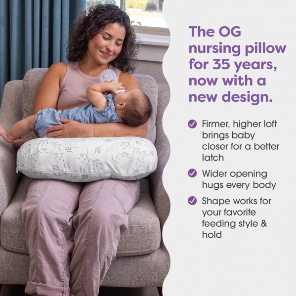 Boppy Nursing Pillow, Gray Gentle Leaves, Larger, More Supportive Pillow for Breastfeeding and Bottle Feeding; Firmer Fill, Higher Lift, Larger Area Than Original Nursing Pillow; JPMA Certified New Nursing Pillow Gray Gentle Leaves