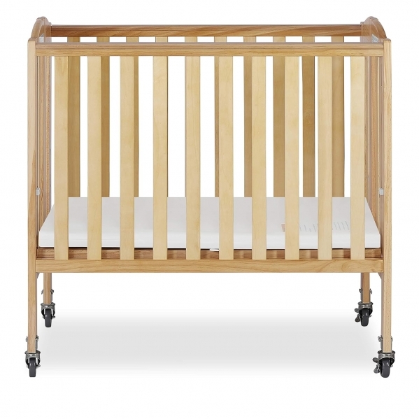 The Dream On Me Folding Portable Crib features a solid birchwood frame with a clean, minimalist design that fits easily into vacation homes, guest rooms, and small spaces. Its patented folding hinge system allows the crib to fold flat for compact storage and easy transport.